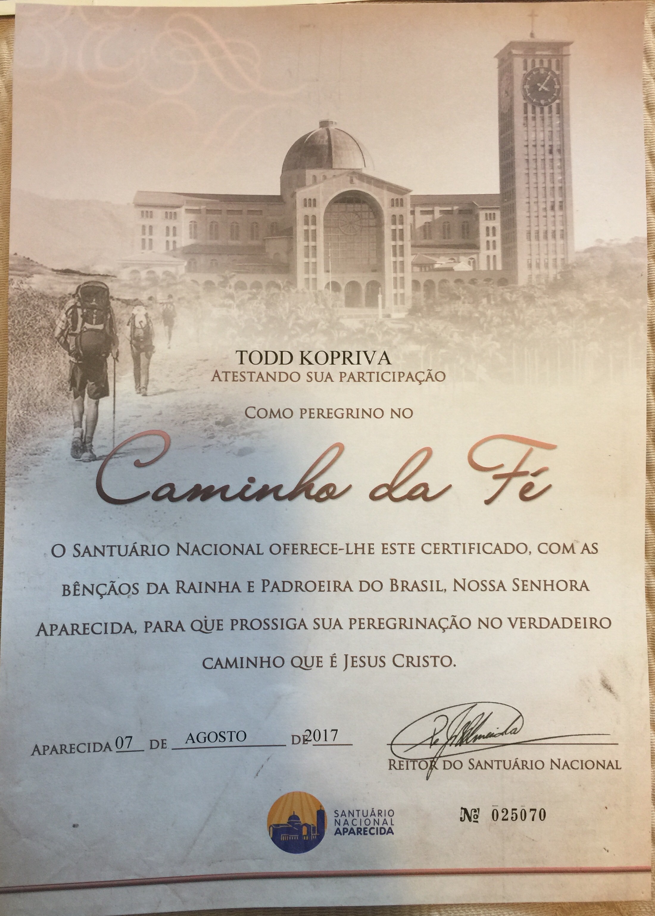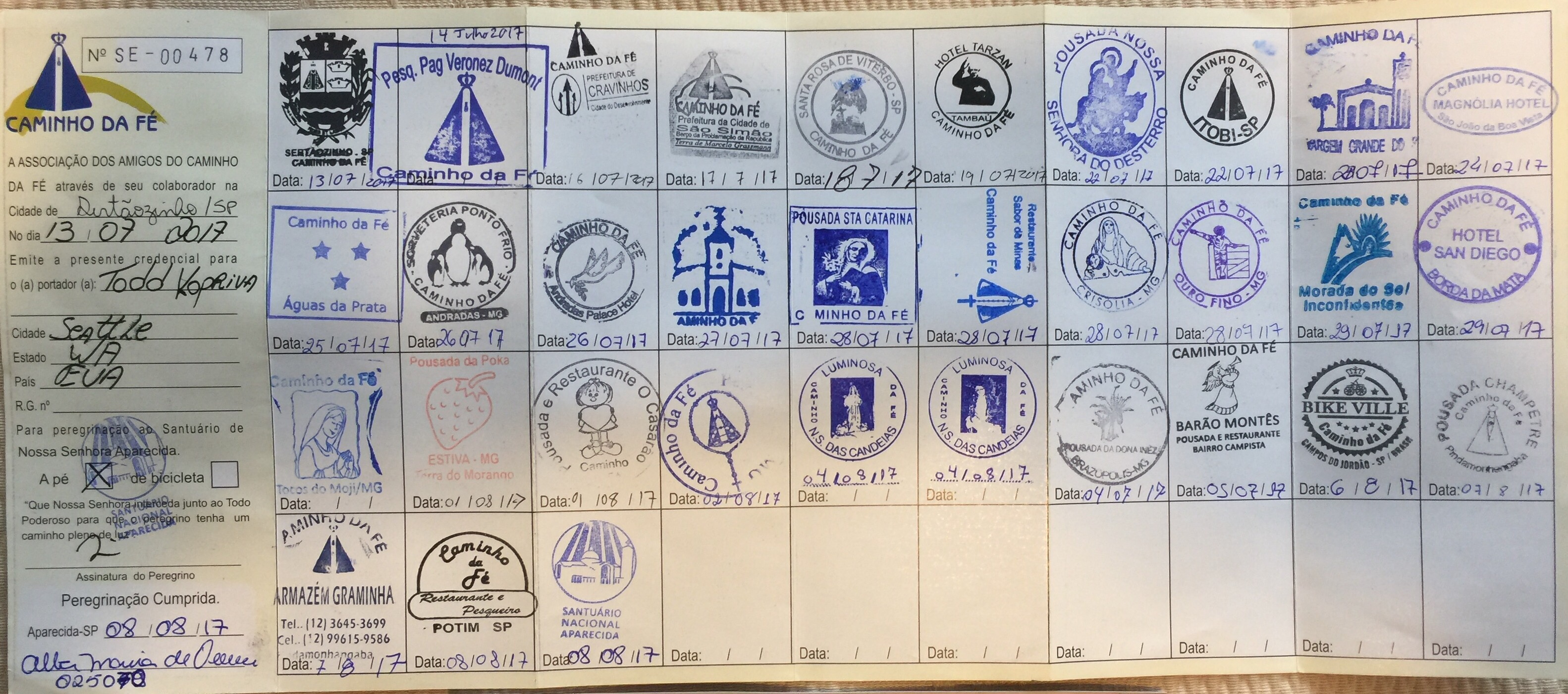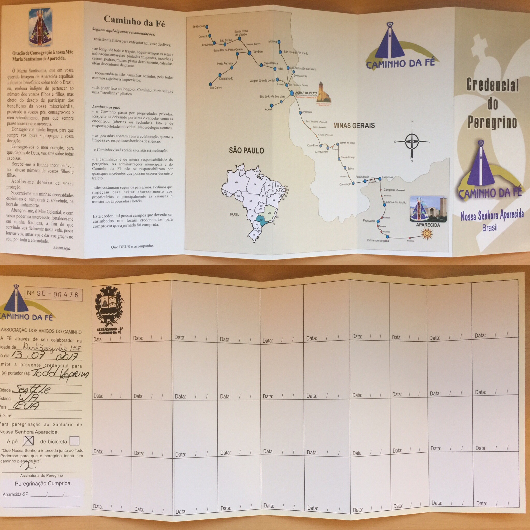This booklet gets stamped at various checkpoints along the Caminho da Fé. I present this in Aparecida at the end to receive a certificate.